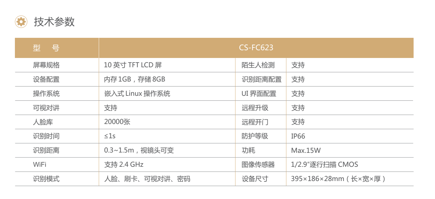 CS-FC623 是一款高性能,高可靠性的單元門(mén)禁產(chǎn)品,依托深度學(xué)習 算法,具有識別速度快、 準確率高的特點(diǎn)。支持人像識別 1:1 和 1:N 模 式,支持刷卡、撥號等功能。