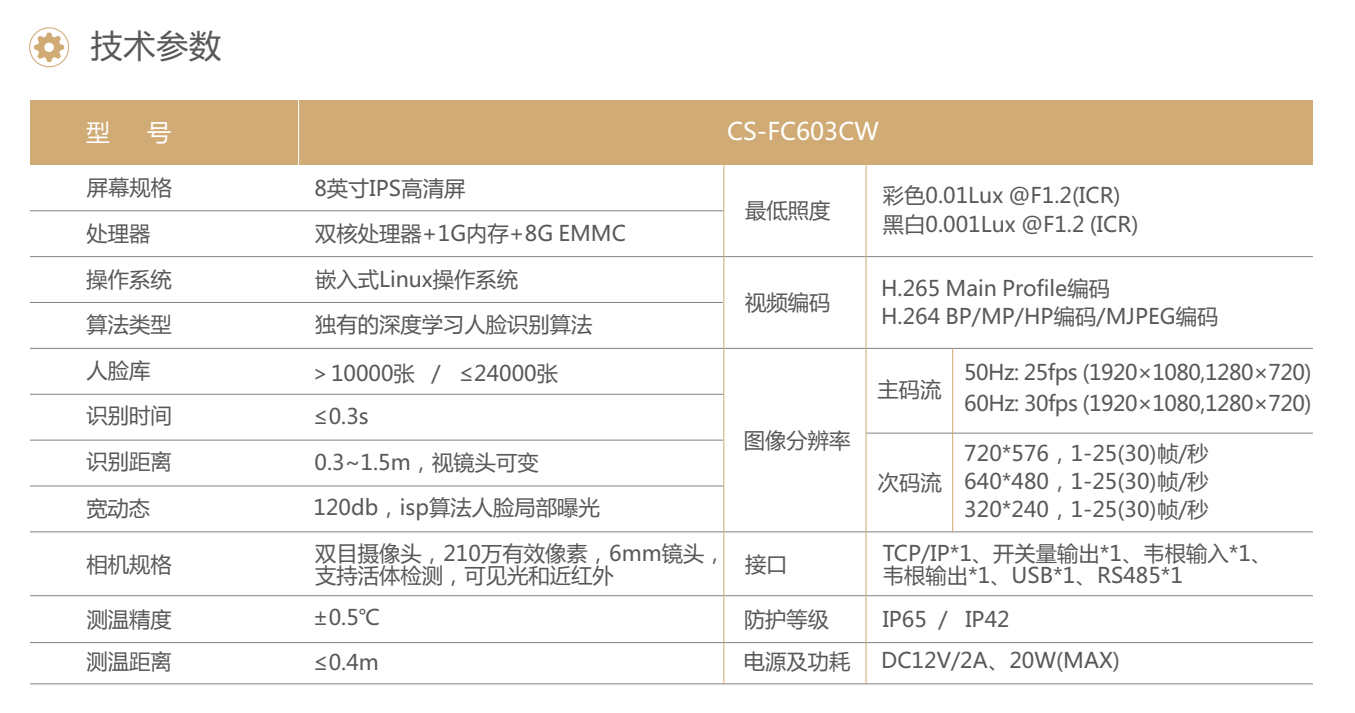 寬動(dòng)態(tài)雙攝活體防偽,徹底解決各類(lèi)照片在各種載體上的欺騙; 夜間紅外、RGB雙補光燈;支持串口、韋根26/34輸入輸出;實(shí)時(shí) 體溫監控,體溫誤差范圍精準到0.5°,體溫檢測距離小于0.5米; 識別速度快, 適用于酒店、寫(xiě)字樓、學(xué)校、醫院、商場(chǎng)等需要用到 人臉門(mén)禁、通道閘機等公共場(chǎng)所。