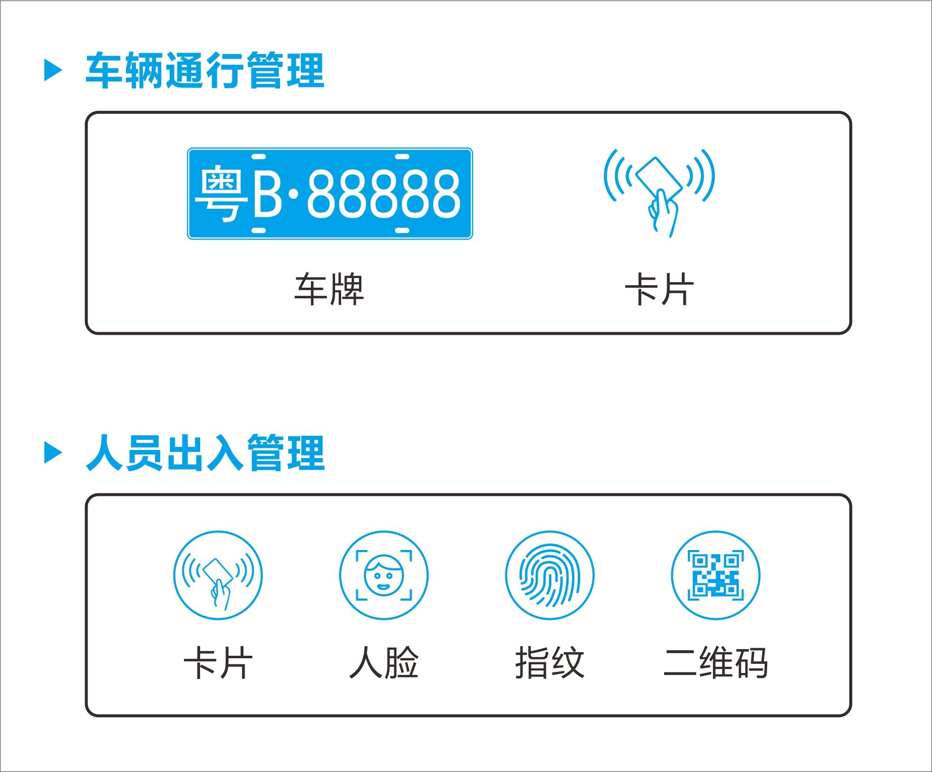 》應用目標《 關(guān)注人多難查、車(chē)雜難管問(wèn)題,采用多樣的識別手段,豐富的應用系統,實(shí)現管控手段的多樣化、數據統計的實(shí)時(shí)化、通行軌跡的可溯化。》解決方案《01/管理方式02/管理區域